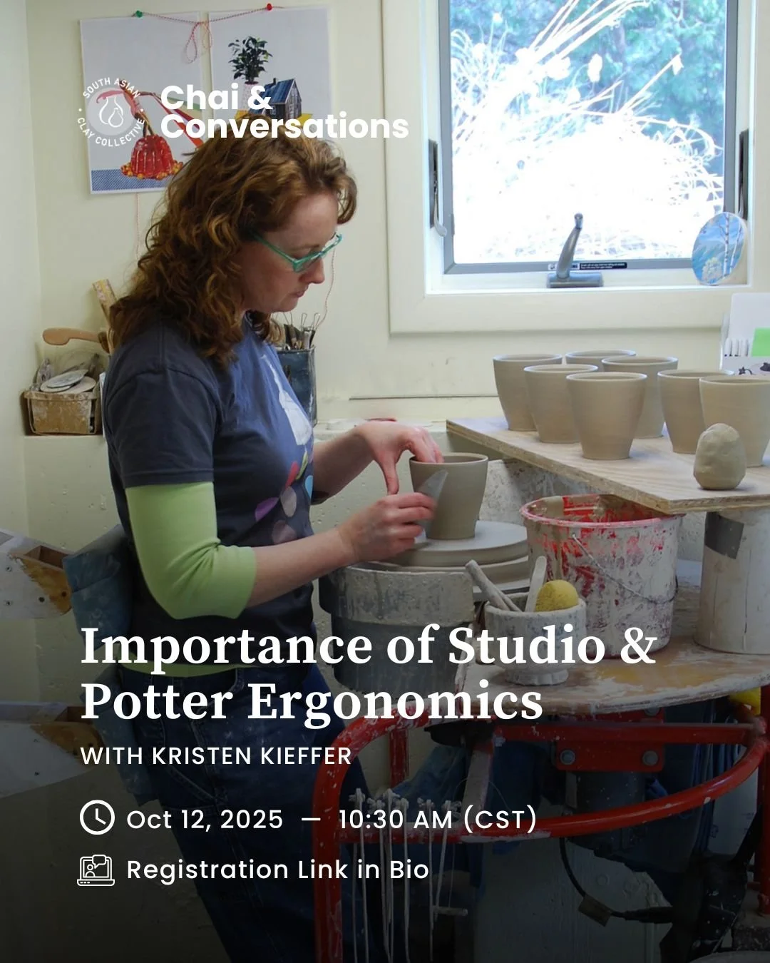 (Registration is required)Join us in welcoming Kristen Kieffer as she shares the benefits of standing to throw and the importance of studio ergonomics for potters. Discover how small adjustments to posture, wheel height, and workspace setup can improve comfort, prevent injury, and support a long-lasting practice. Ideal for potters of all levels who want to protect their bodies while refining their craft.
